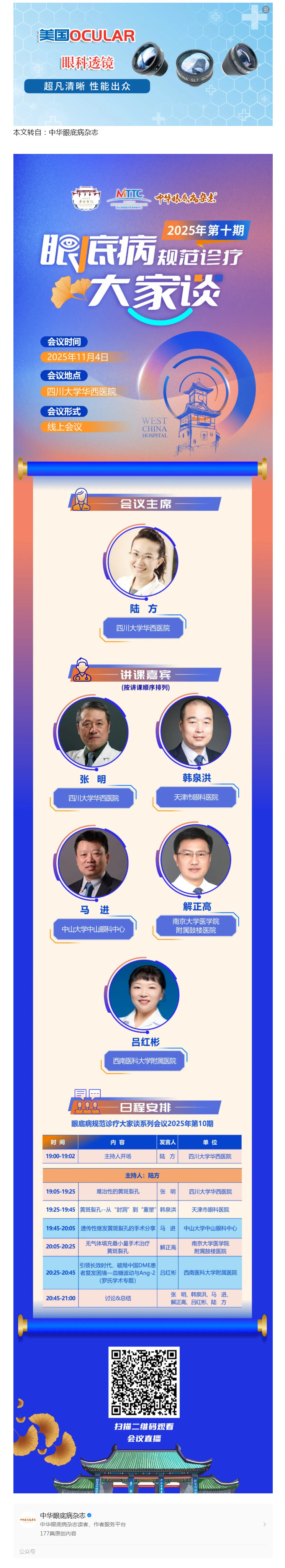 眼底病规范诊疗大家谈第10期将于11月4日(下周二)晚19:00-21:00线上召开!---2025--10-29 发布时间:2025-10-29 来源: 作者: