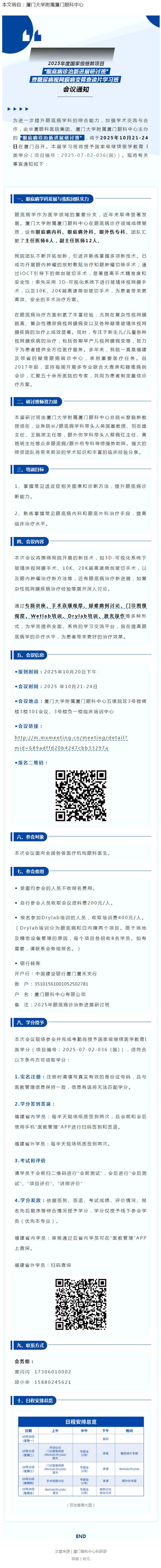 10.21-24厦门丨2025年度国家级继教项目“眼底病诊治新进展研讨班”暨糖尿病视网膜病变筛查读片学习班会议通知--2025-09-30 发布时间:2025-09-30 来源: 作者: