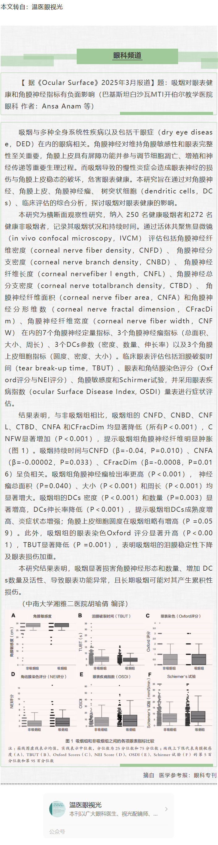 《Ocular Surface》:吸烟对眼表健康和角膜神经指标有负面影响---2025.9.25 发布时间:2025-09-25 来源: 作者: