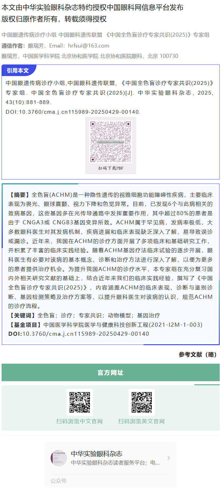 【指南与共识】中国全色盲诊疗专家共识(2025)---2025.10.27 发布时间:2025-10-27 来源: 作者: