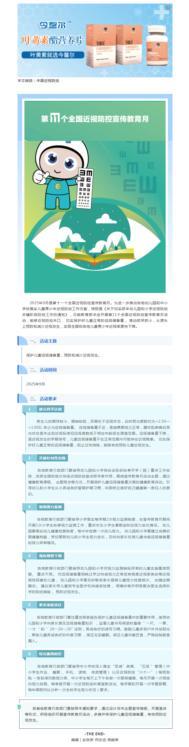 教育部:开展第11个全国近视防控宣传教育月活动---2025-09-11 发布时间:2025-09-11 来源: 作者:
