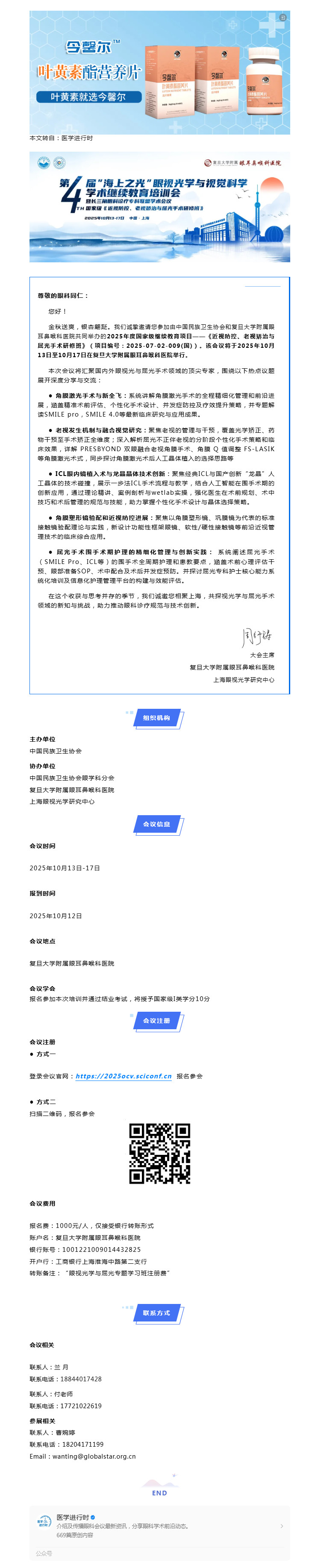 10.13-17上海|第四届“海上之光”眼视光学与视觉科学学术继续教育培训会暨近视防控、老视矫治与屈光手术研修班(会议通知)---2025-09-24 发布时间:2025-09-24 来源: 作者: