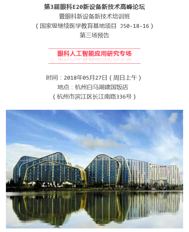 本文标题:【会议预告】第3届眼科E20新设备新技术高峰论坛第三场预告--眼科人工智能应用研究专场(05.27 杭州)_中国眼科网_www.yanke360.com |