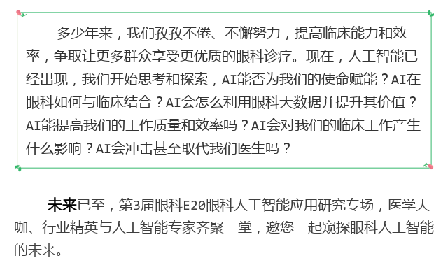 本文概述:未来已至,第3届眼科E20新设备新技术高峰论坛--眼科人工智能应用研究专场,医学大咖/行业精英与人工智能专家齐聚一堂,邀您一起窥探眼科人工智能的未来. |