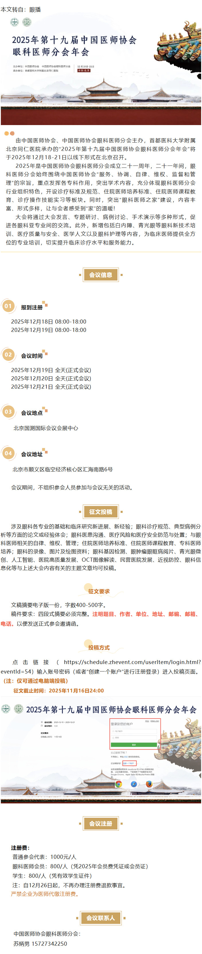 征文截止至11.16 | 2025年第十九届中国医师协会眼科医师分会年会 ---2025.9.23 发布时间:2025-09-23 来源: 作者:
