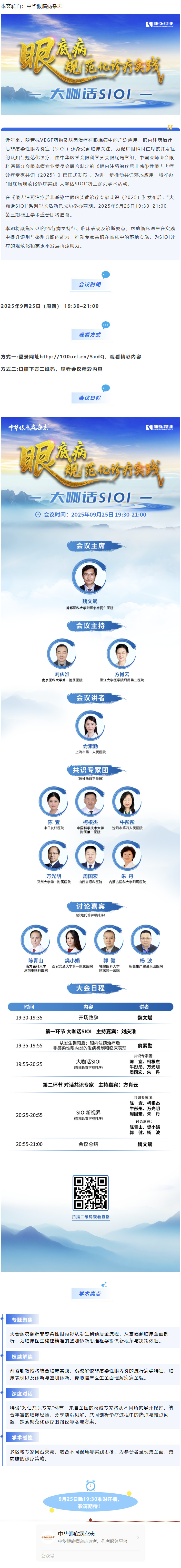 9.25线上丨眼底病规范化诊疗实践-大咖话SIOI——《眼内注药治疗后非感染性眼内炎症诊疗专家共识》第三期解读---2025.9.24 发布时间:2025-09-24 来源: 作者: