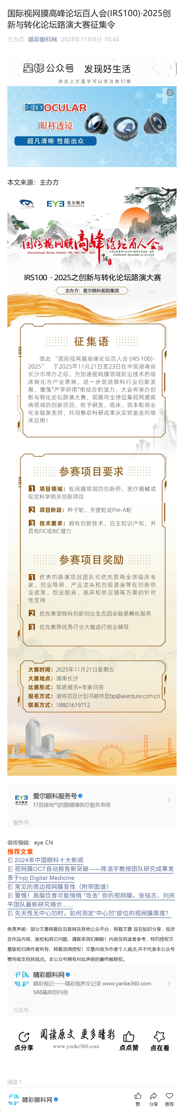 新闻中心 您的当前位置:首页 > 新闻中心 > 国际视网膜高峰论坛百 国际视网膜高峰论坛百人会(IRS100)·2025创新与转化论坛路演大赛征集令--------2025-11-6 发布时间:2025-11-06 来源: 作者: