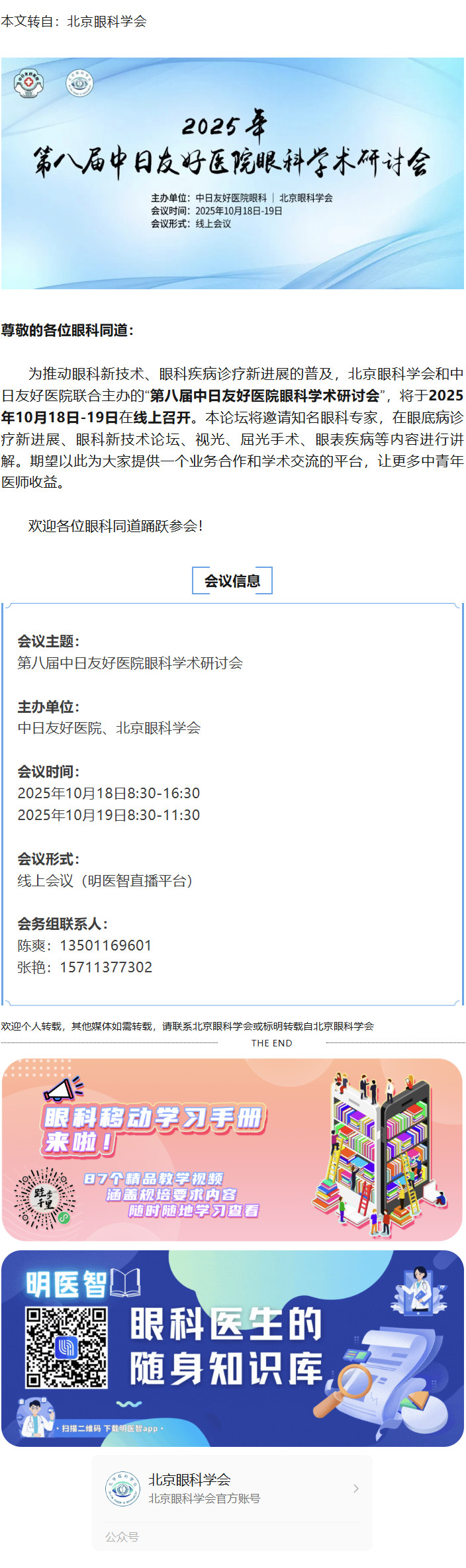 10.18-19 线上丨第八届中日友好医院眼科学术研讨会 第一轮通知---2025.9.23 发布时间:2025-09-23 来源: 作者: