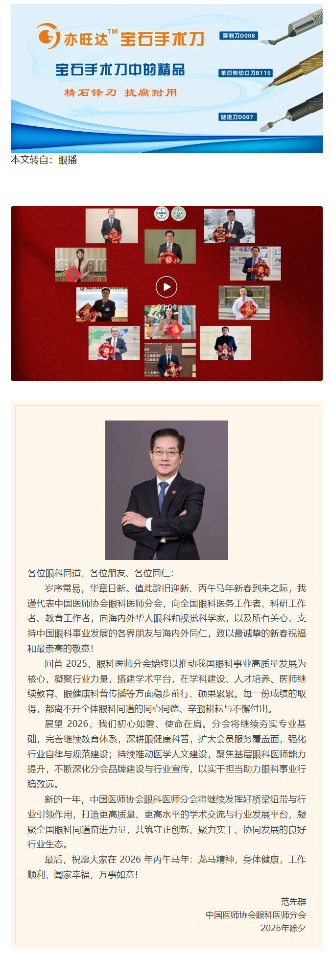 初心如磐 聚力前行|中国医师协会眼科医师分会2026年新年贺词---2026-02-24 发布时间:2026-02-24 来源: 作者: