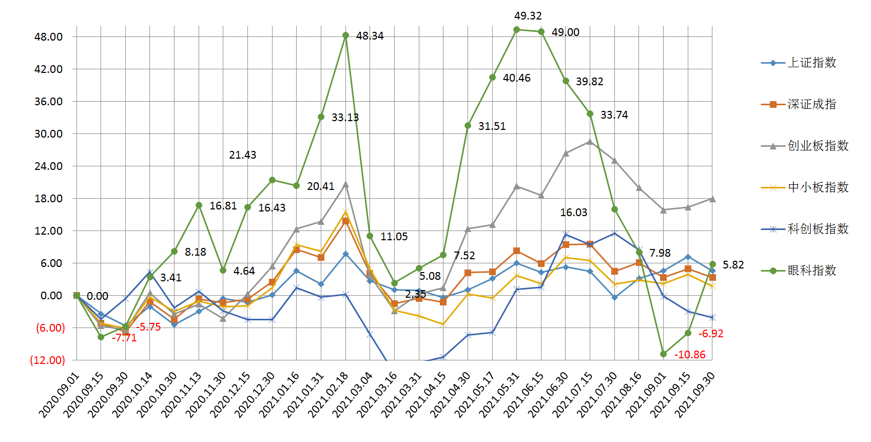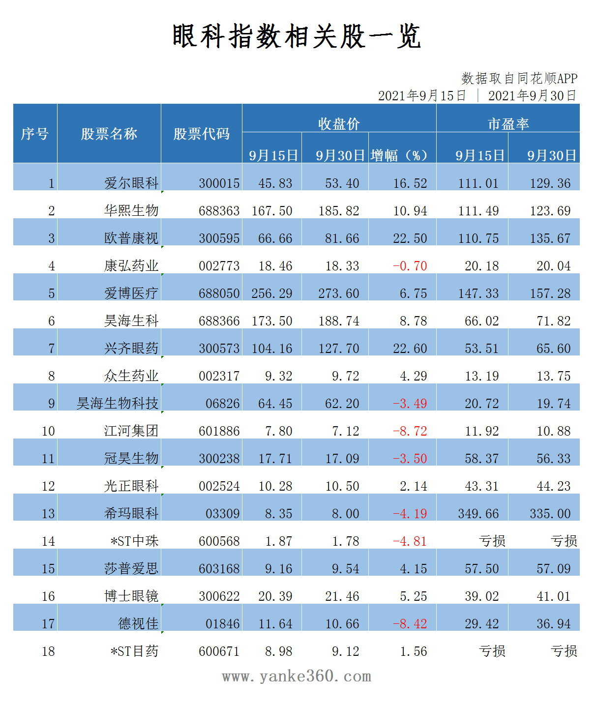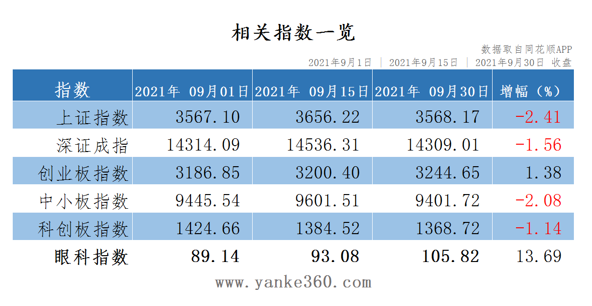 注:眼科指数分别以2020年9月1日收盘价、2020年9月15日收盘价、2020年9月30日收盘价、2020年10月14日收盘价、2020年10月30日收盘价、2020年11月13日收盘价、 2020年11月30日收盘价、2020年12月15日收盘价、2020年12月30日收盘价、 2021年1月16日收盘价、 2021年1月31日收盘价、 2021年2月18日收盘价、 2021年3月4日收盘价、2021年3月16日收盘价、2021年3月31日收盘价、2021年4月15日收盘价、2021年4月30日收盘价、2021年5月17日收盘价、2021年5月31日收盘价、2021年6月15日收盘价,2021年6月30日收盘价,2021年7月15日收盘价,2021年7月30日收盘价,2021年8月16日收盘价,2021年9月1日收盘价,2021年9月15日收盘价,2021年9月30日收盘价为准。