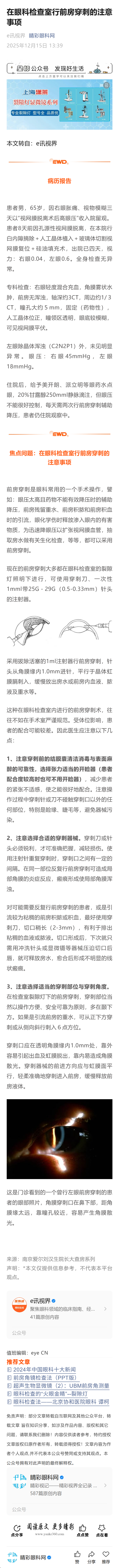 > 在眼科检查室行前房穿