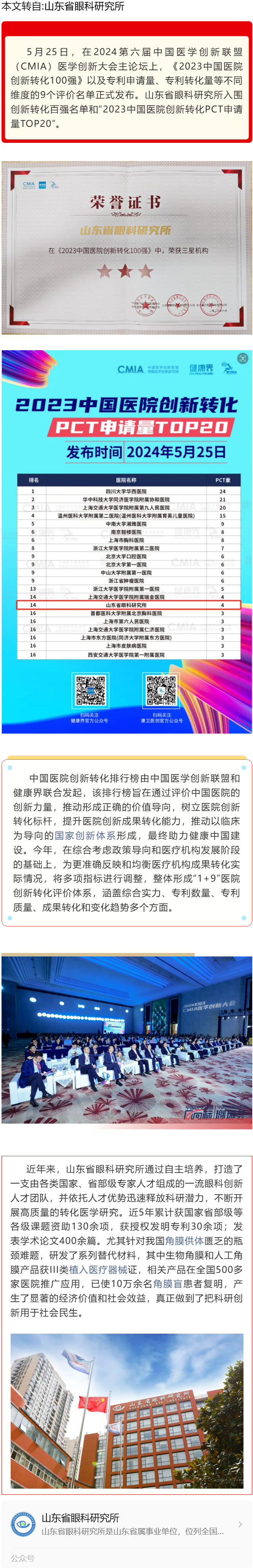 山东省眼科研究所入围2023中国医院创新转化100强---2024.5.31 发布时间:2024-05-31 来源:山东省眼科研究所 作者:山东省眼科研究所