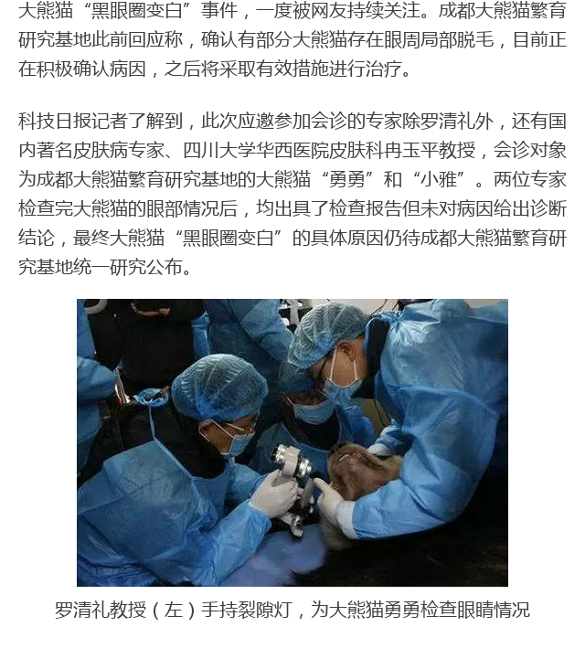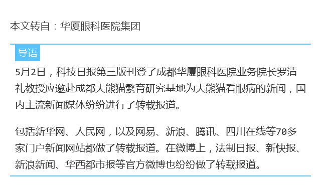 本文概述:5月2日,科技日报第三版刊登了成都华厦眼科医院业务院长罗清礼教授应邀赴成都大熊猫繁育研究基地为大熊猫看眼病的新闻,国内主流新闻媒体纷纷进行了转载报道. |