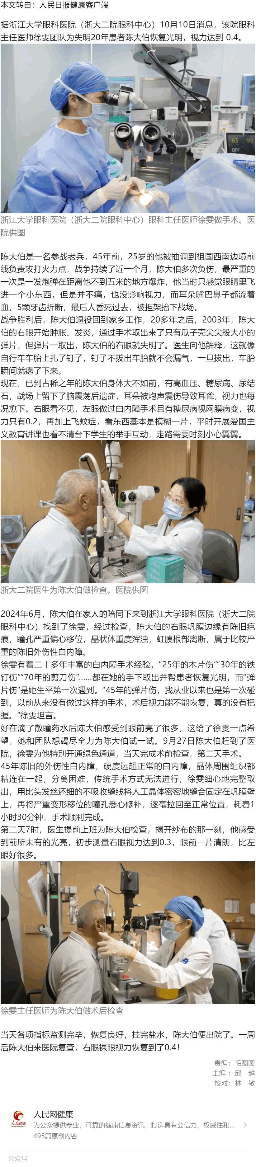 因弹片进眼失明20年,浙大二院徐雯团队为患者重拾光明---2024.10.14 发布时间:2024-10-14 来源:人民日报健康客户端 作者:人民日报健康客户端