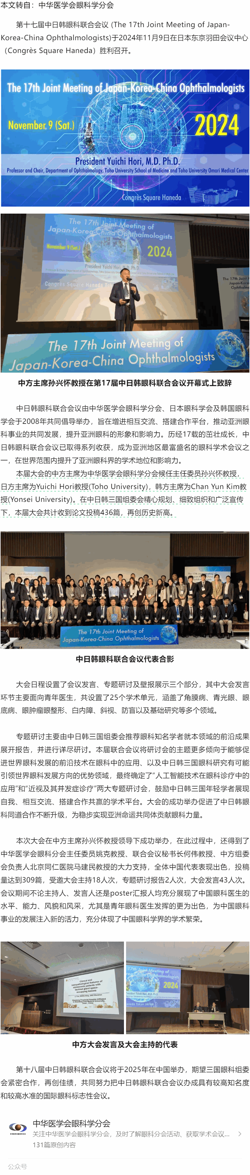 第十七届中日韩眼科联合会议在日本东京圆满召开---2024.11.13 发布时间:2024-11-13 来源:中华医学会眼科学分会 作者:中华医学会眼科学分会