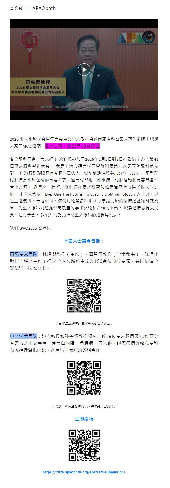范先群院士诚邀全球眼科同仁踊跃投稿竞逐APAO 2026学术殊荣--2025-10-15 发布时间:2025-10-15 来源: 作者:
