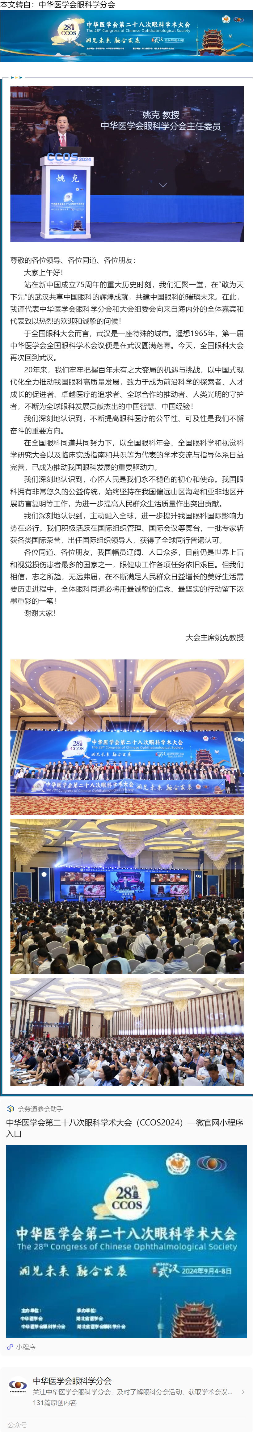 洞见未来 融合发展,谋划中国式现代化眼科之路——大会主席姚克教授开幕致辞---2024.9.6 发布时间:2024-09-06 来源:中华医学会眼科学分会 作者:中华医学会眼科学分会