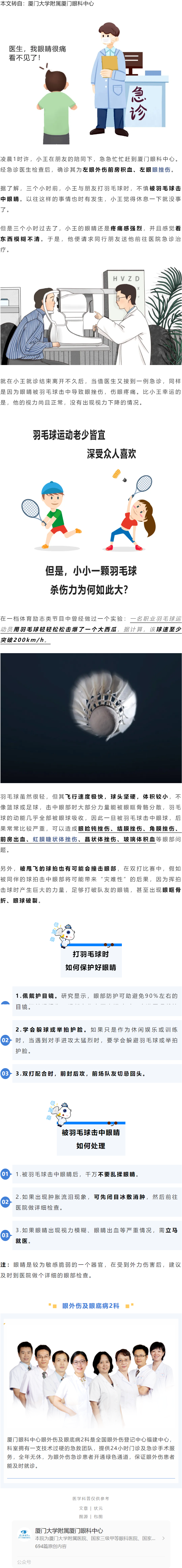 1小时内接到2例急诊!眼睛被羽毛球击中后看不清,医生提醒……---2024.9.9 发布时间:2024-09-09 来源:厦门大学附属厦门眼科 作者:厦门大学附属厦门眼科