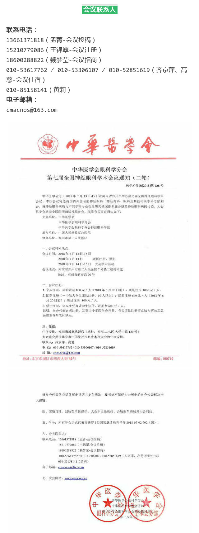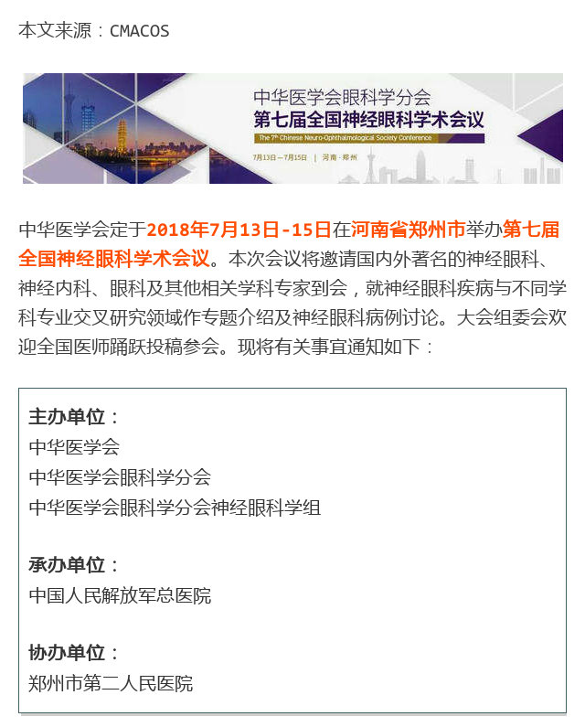 新闻中心 您的当前位置:首页 > 新闻中心 > 【第二轮通知】第七届 【第二轮通知】第七届全国神经眼科学术会议(07.13-15 郑州)------------------------------------2018-6-5 发布时间:2018-06-05 来源:CMACOS 作者: 原文链接 更多新闻请点击: http://www.yanke360.com/news/