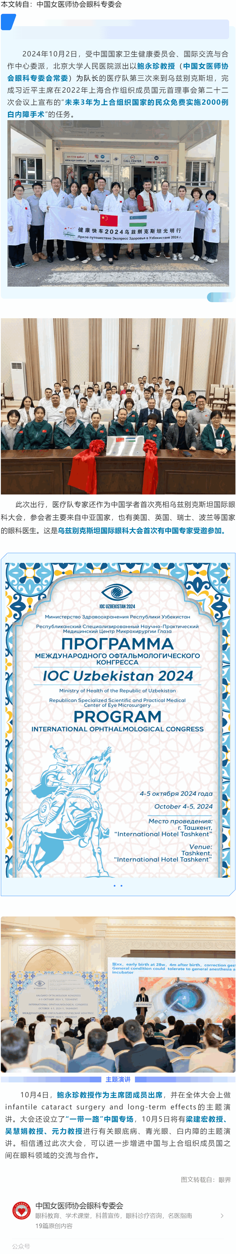 鲍永珍教授参加乌兹别克斯坦眼科年会并做主题演讲---2024.10.8 发布时间:2024-10-08 来源:中国女医师协会眼科专 作者:中国女医师协会眼科专