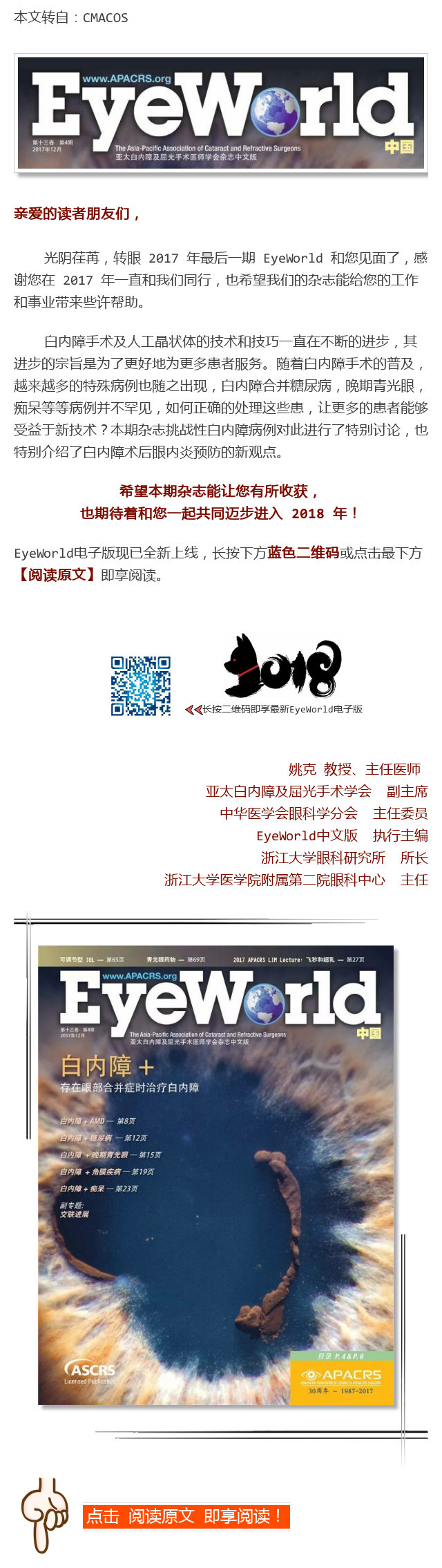 新闻中心 您的当前位置:首页 > 新闻中心 > EyeWorld 中文版 | 第 EyeWorld 中文版 | 第十三卷 第4期上线啦!------------------------2018-02-05 发布时间:2018-02-05 来源:CMACOS 作者: 阅读原文 更多新闻请点击: http://www.yanke360.com/news/