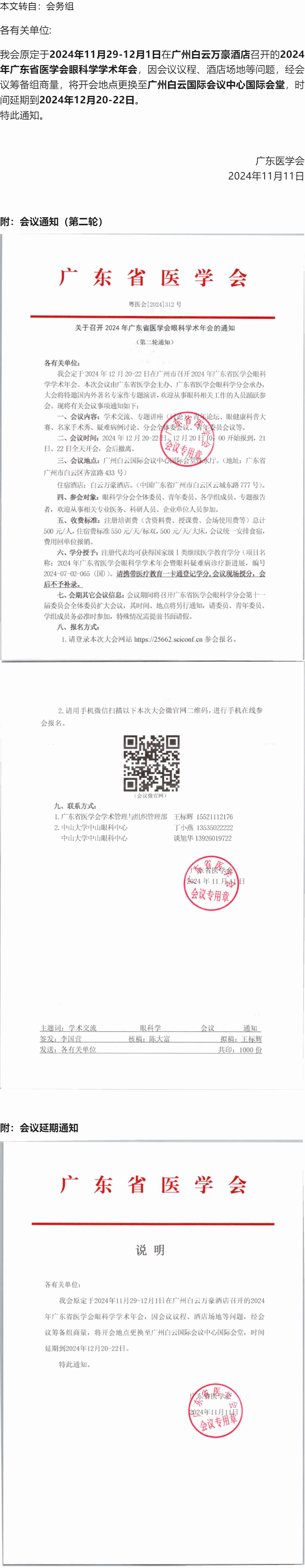 延期通知 | 2024年广东省医学会眼科学学术年会(12.20-22广州)---2024.11.11 发布时间:2024-11-11 来源:会务组 作者:会务组