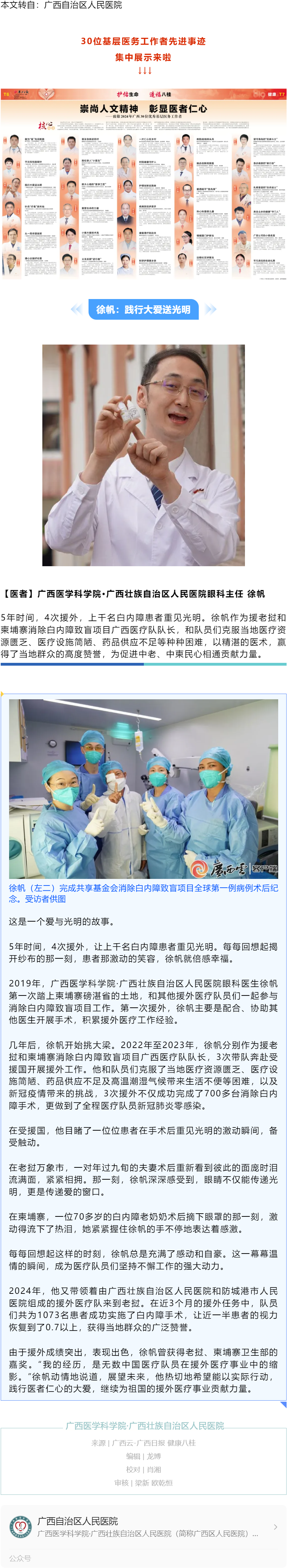 基层医务工作者先进典型事迹 | 徐帆:5年4次援外送光明---2024.8.23 发布时间:2024-08-23 来源:广西自治区人民医院 作者:广西自治区人民医院