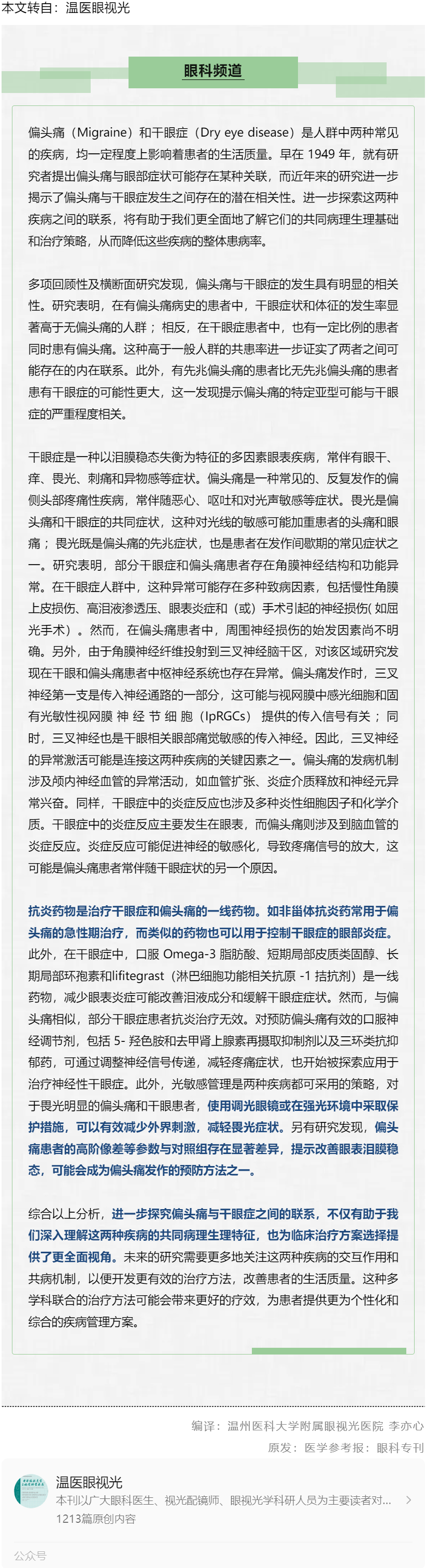 偏头痛与干眼症之间有何联系?这些研究揭示了相关规律---2024.9.24 发布时间:2024-09-24 来源:温医眼视光 作者:温医眼视光