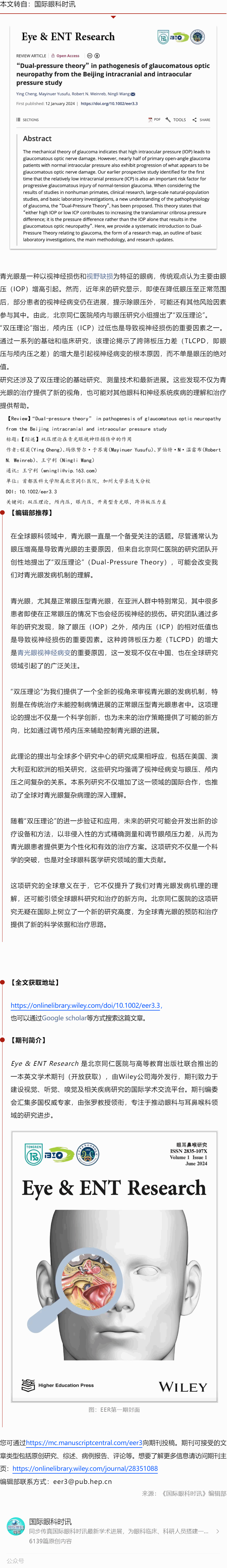 中国之声 | 王宁利教授团队在Eye & ENT Research杂志发表综述:双压理论在青光眼视神经损伤中的作用---2024.11.21 发布时间:2024-11-21 来源:国际眼科时讯 作者:国际眼科时讯