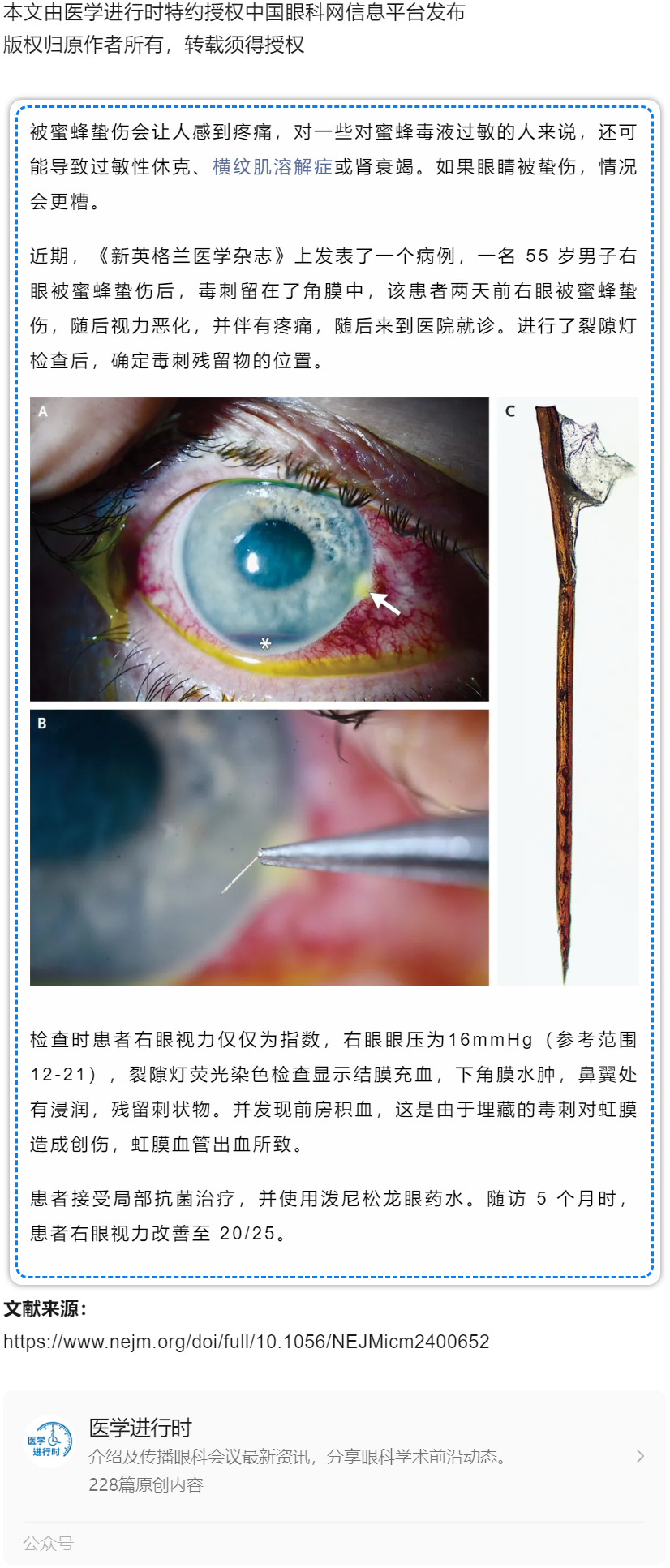 险象环生!蜜蜂刺入角膜后的救治历程---2024.7.25 发布时间:2024-07-25 来源:医学进行时 作者:医学进行时