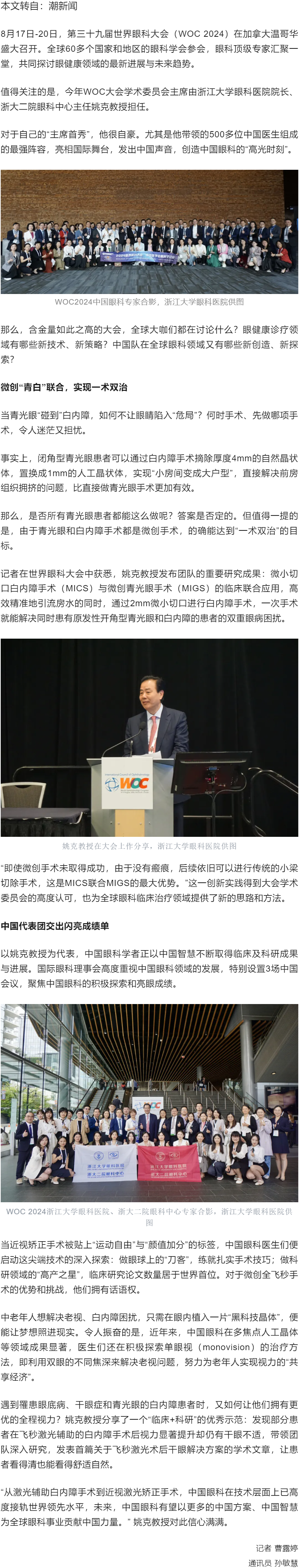 中国眼科力量闪耀世界眼科大会:中国医生首任主席,三场中国会议备受瞩目---2024.8.21 发布时间:2024-08-21 来源:潮新闻 作者:潮新闻
