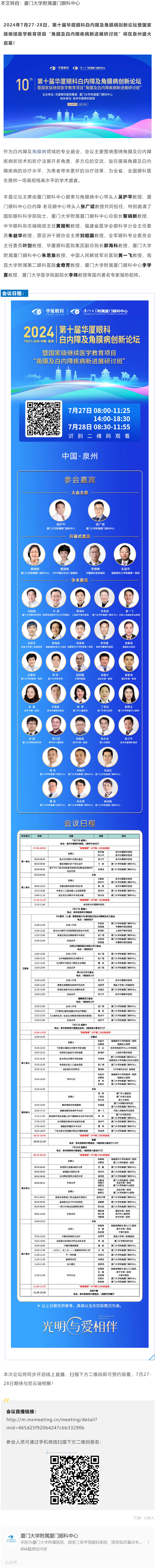 7.27-28泉州 | 第十届华厦眼科白内障及角膜病创新论坛暨“角膜及白内障疾病新进展研讨班”---2024.7.24 发布时间:2024-07-24 来源:厦门大学附属厦门眼科 作者:厦门大学附属厦门眼科
