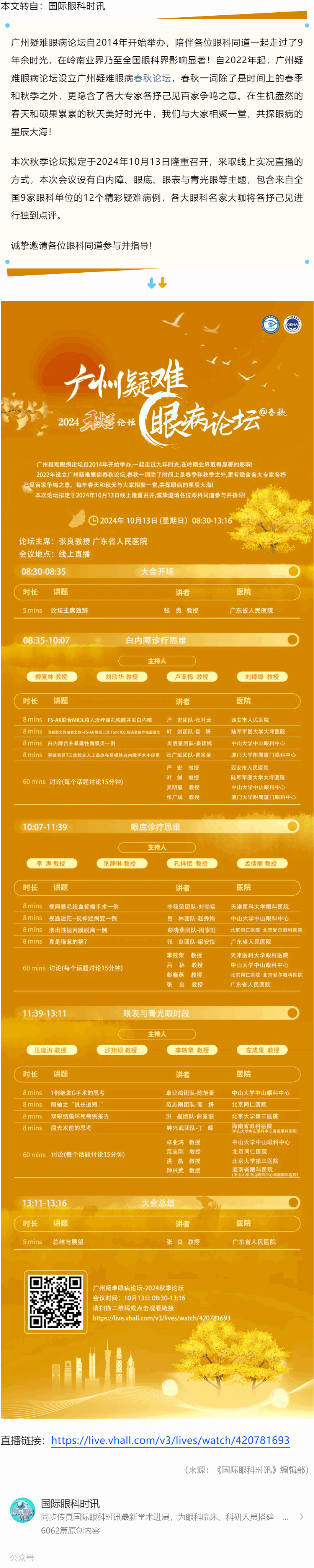10.13直播 | 广州疑难眼病春秋论坛2024秋季论坛---2024.10.12 发布时间:2024-10-12 来源:国际眼科时讯 作者:国际眼科时讯