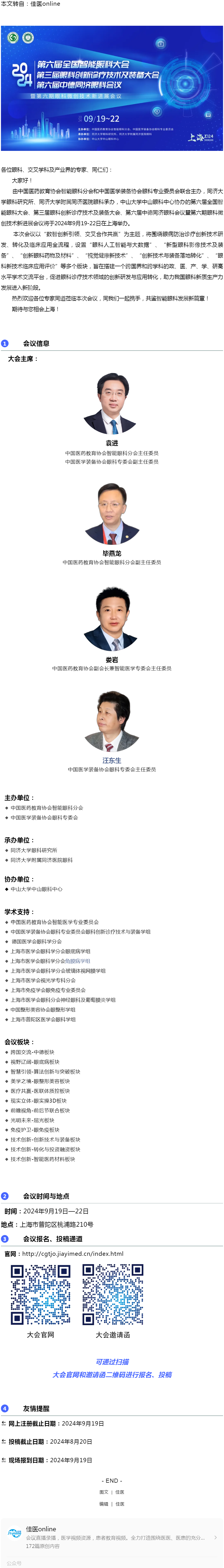 会议预告 | 第六届全国智能眼科大会、第三届眼科创新诊疗技术及装备大会、第六届中德同济眼科会议暨第六期眼科微创技术新进展会议---2024.7.4 发布时间:2024-07-04 来源:佳医online 作者:佳医online