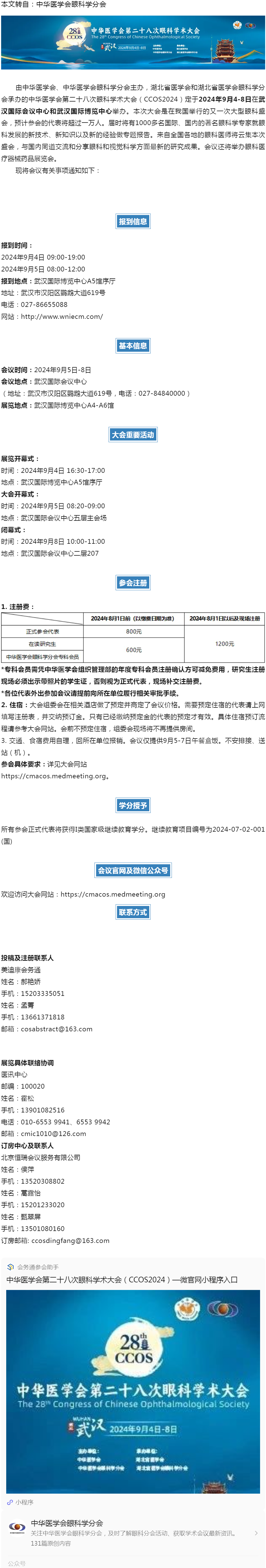 9.4-8武汉 | 中华医学会第二十八次眼科学术大会---2024.7.1 发布时间:2024-07-01 来源:中华医学会眼科学分会 作者:中华医学会眼科学分会