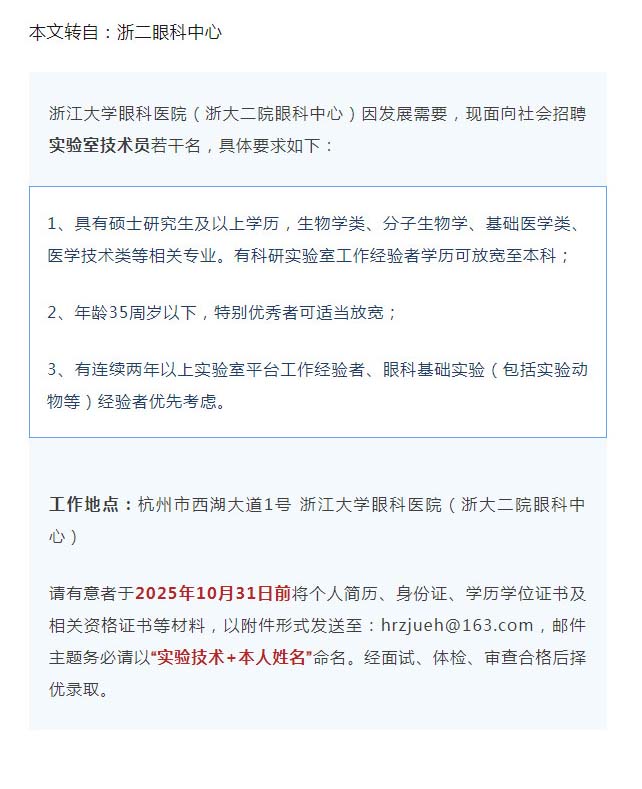 招聘|浙江大学眼科医院(浙大二院眼科中心)招聘实验室技术员--2025-10-16 发布时间:2025-10-16 来源: 作者: