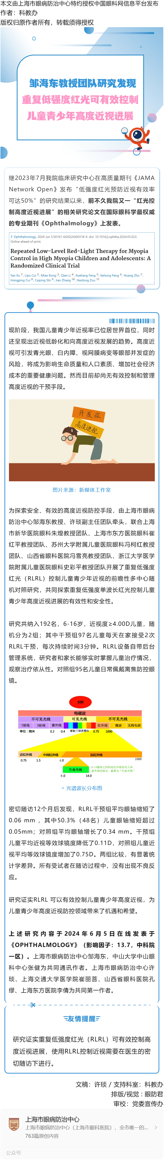 邹海东教授团队研究发现:重复低强度红光可有效控制儿童青少年高度近视进展---2024.6.26 发布时间:2024-06-26 来源:上海市眼病防治中心 作者:科教办