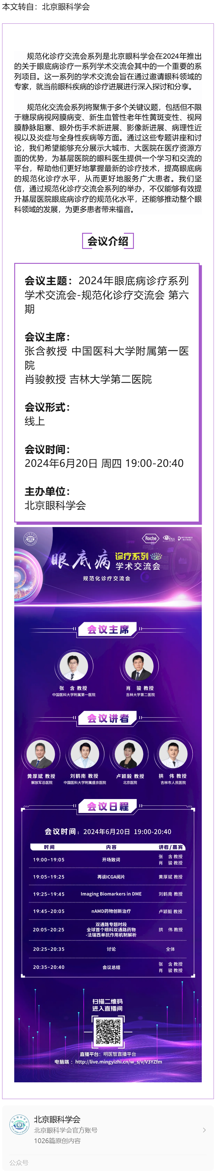 6.20线上 | 2024年眼底病诊疗系列学术交流会-规范化诊疗交流会 第六期---2024.6.19 发布时间:2024-06-19 来源:北京眼科学会 作者:北京眼科学会