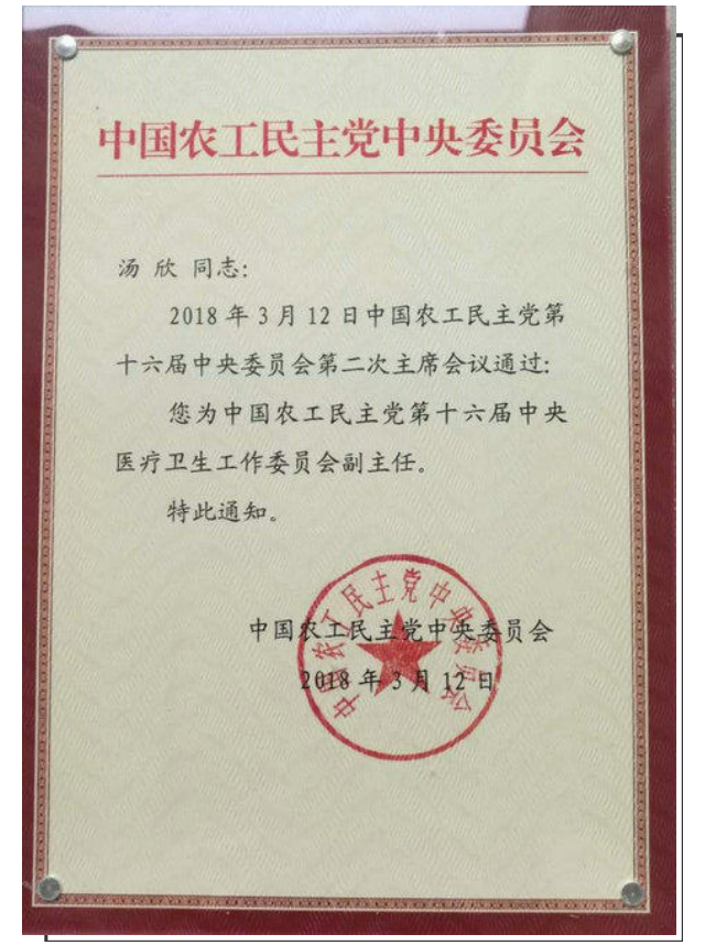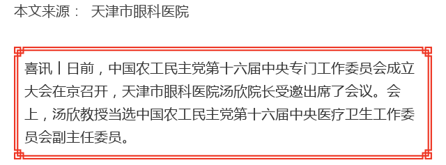 新闻中心 您的当前位置:首页 > 新闻中心 > 汤欣教授当选中国农工 汤欣教授当选中国农工民主党第十六届中央医疗卫生工作委员会副主任委员---------------2018-04-04 发布时间:2018-04-04 来源:天津市眼科医院 作者: 原文链接 更多新闻请点击: http://www.yanke360.com/news/