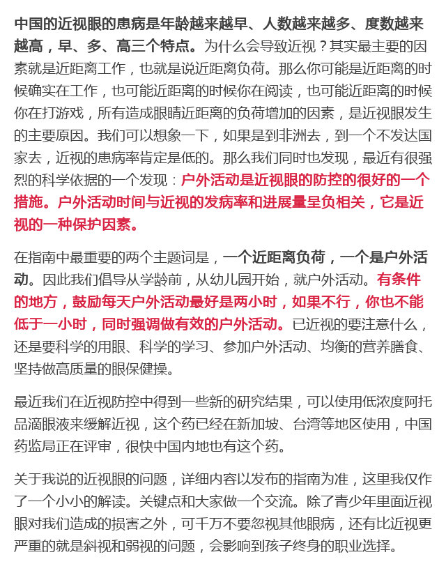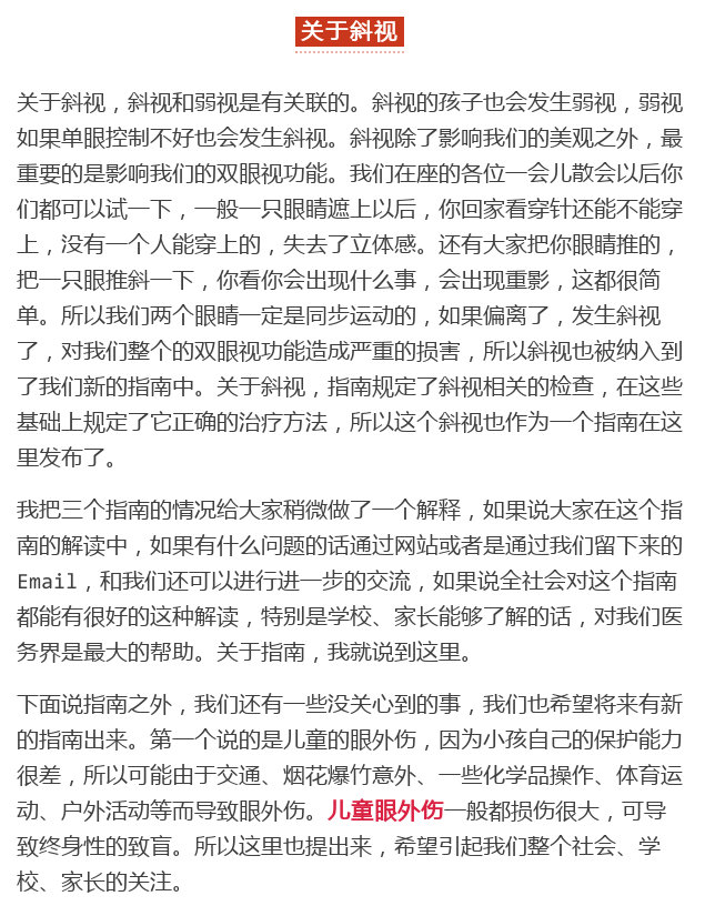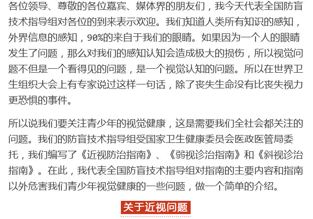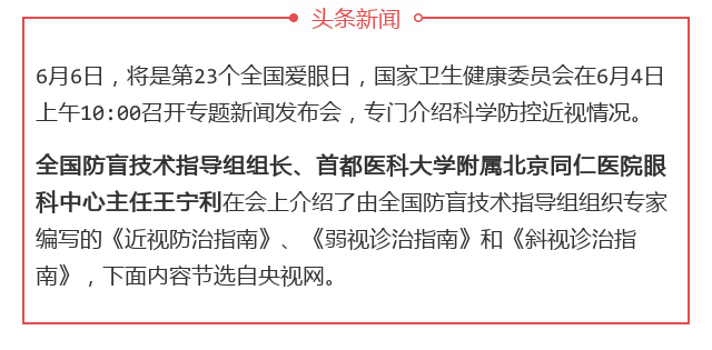 新闻中心 您的当前位置:首页 > 新闻中心 > 全国防盲技术指导组组 全国防盲技术指导组组长王宁利在国家卫生健康委员会爱眼日专题发布会上解读三类眼病指南-----------------2018-06-05 发布时间:2018-06-05 来源: 作者:王宁利 原文链接 国家卫生健康委员会2018年6月4日新闻发布会文字实录 近视防治指南 弱视诊治指南 斜视诊治指南 更多新闻请点击: http://www.yanke360.com/news/
