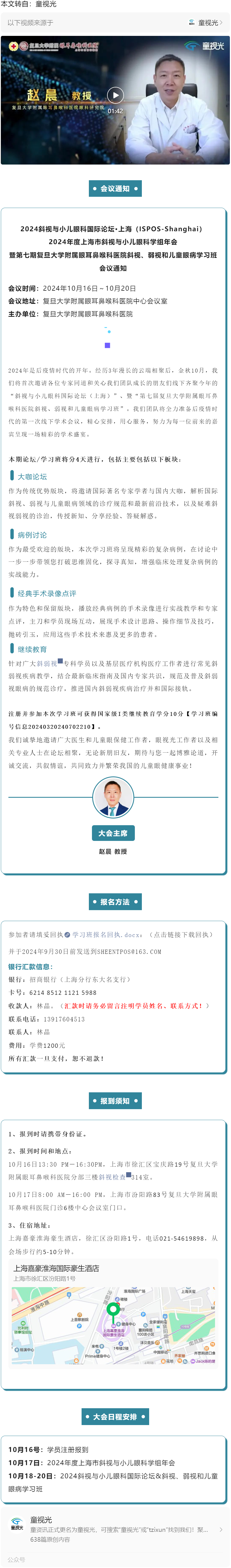 10.16-20上海 | 2024斜视与小儿眼科国际论坛第一轮通知---2024.8.20 发布时间:2024-08-20 来源:童视光 作者:童视光