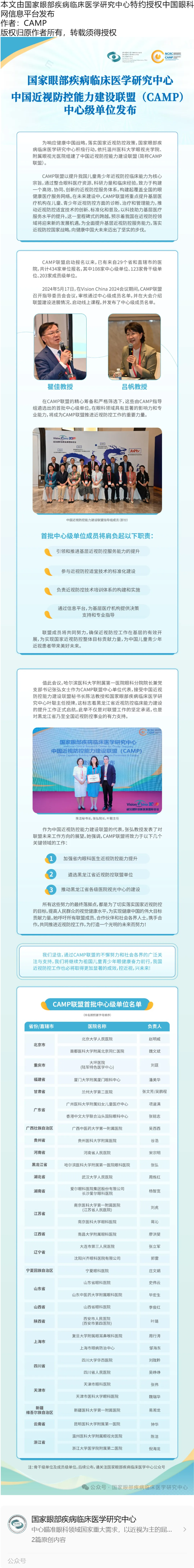 中国近视防控能力建设联盟(CAMP)中心级单位发布---2024.5.28 发布时间:2024-05-28 来源:国家眼部疾病临床医学 作者:CAMP
