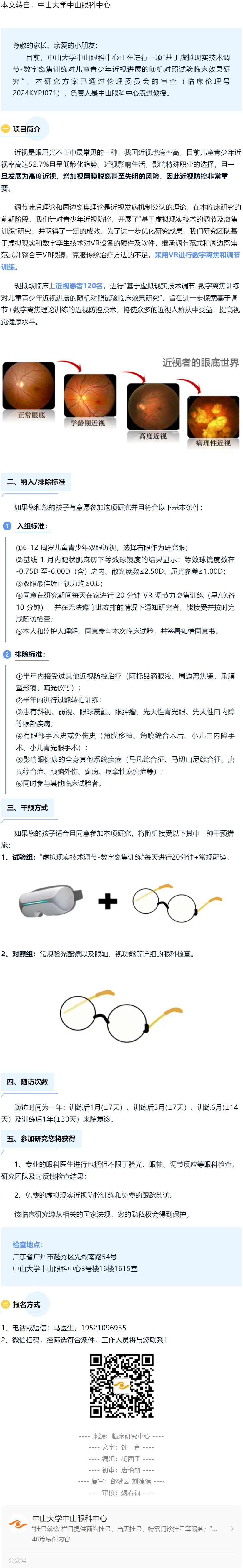 【招募】VR调节及离焦训练,对儿童青少年近视防控有效吗?---2024.8.12 发布时间:2024-08-12 来源:中山大学中山眼科中心 作者:中山大学中山眼科中心