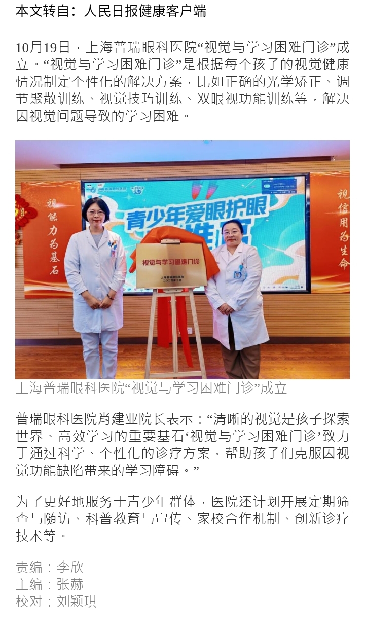 上海普瑞眼科青少年视觉与学习困难门诊成立--2024-10-24 发布时间:2024-10-24 来源: 作者: