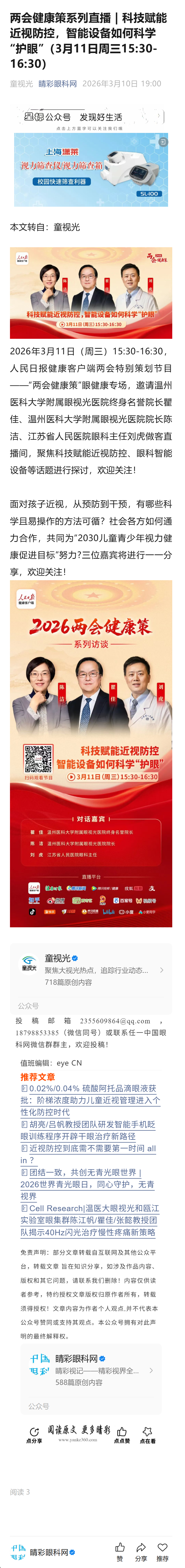 新闻中心 您的当前位置:首页 > 新闻中心 > 两会健康策系列直播 | 两会健康策系列直播 | 科技赋能近视防控,智能设备如何科学“护眼”(3月11日周三15:30-16:30)----2026-3-10 发布时间:2026-03-10 来源: 作者: