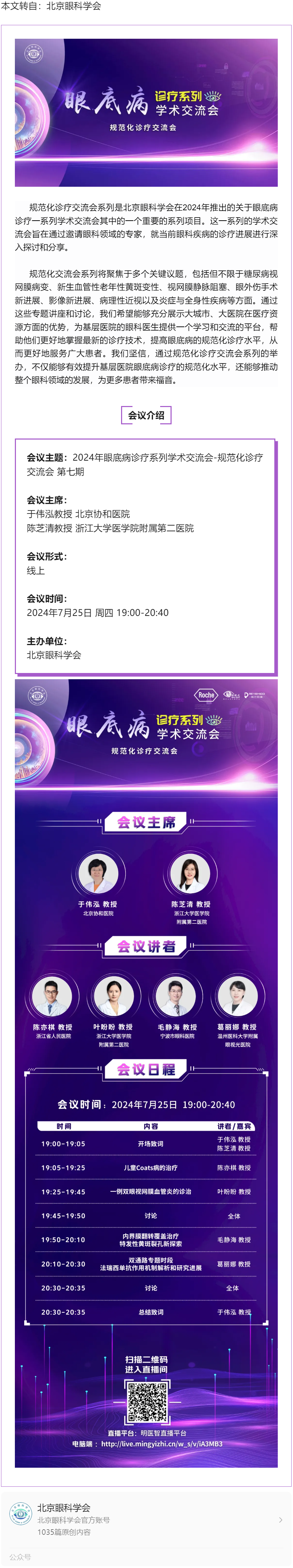 7.25直播 | 2024年眼底病诊疗系列学术交流会-规范化诊疗交流会 第七期---2024.7.17 发布时间:2024-07-17 来源:北京眼科学会 作者:北京眼科学会