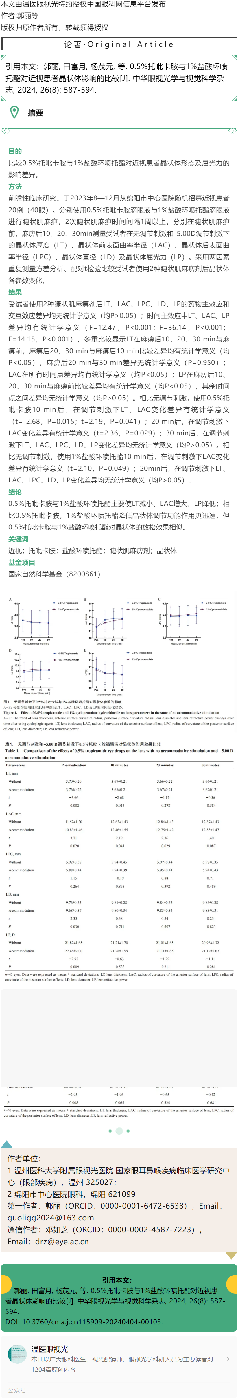 0.5%托吡卡胺与1%盐酸环喷托酯对近视患者晶状体影响的比较---2024.8.27 发布时间:2024-08-27 来源:温医眼视光 作者:郭丽等