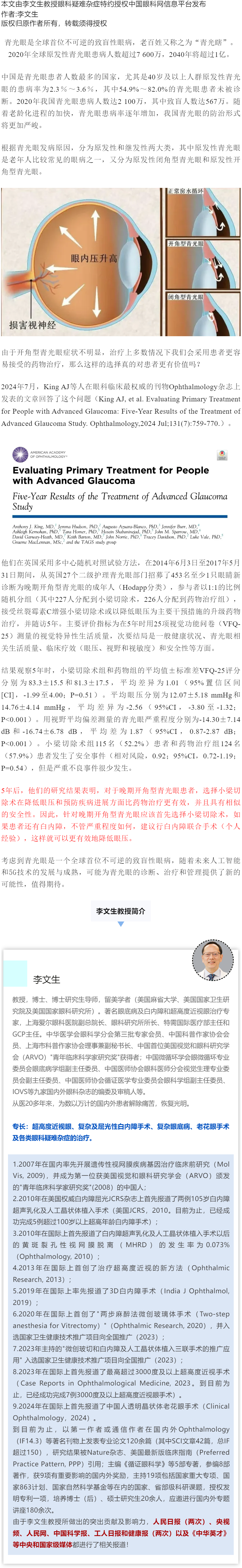 国际眼科速递:手术和药物治疗晚期开角型青光眼,应该选哪一个?—晚期青光眼治疗研究的五年结果报告---2024.7.16 发布时间:2024-07-16 来源:李文生教授眼科疑难杂 作者:李文生
