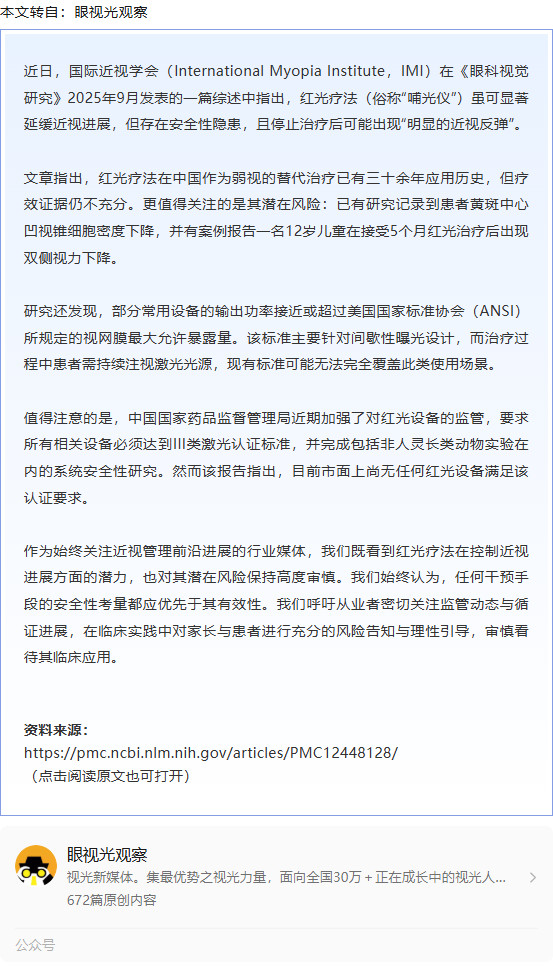 国际近视学会报告:红光疗法延缓近视但存安全隐忧,停用或致明显反弹---2025.10.23 发布时间:2025-10-23 来源: 作者:
