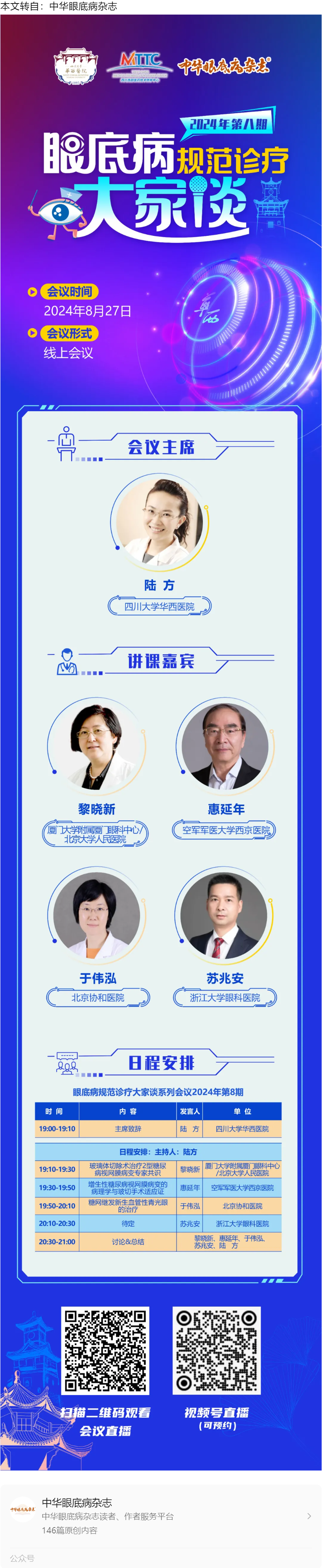 8.27直播 | 眼底病规范诊疗大家谈2024年第8期---2024.8.26 发布时间:2024-08-26 来源:中华眼底病杂志 作者:中华眼底病杂志